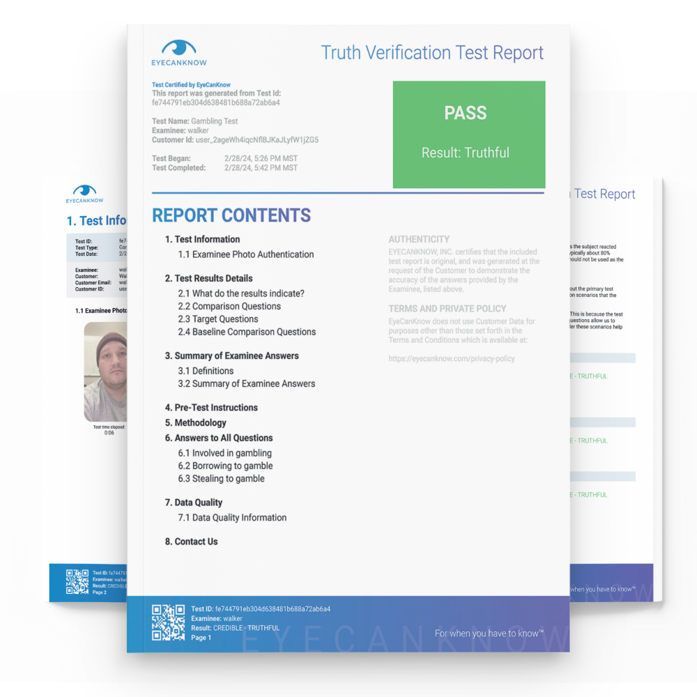 EyeCanKnow tests are not knowledge-based tests. Actions, behaviors, or past events should be concrete and easily defined. Our lie detector tests focus on actions or behaviors that are of the most concern; examples include: